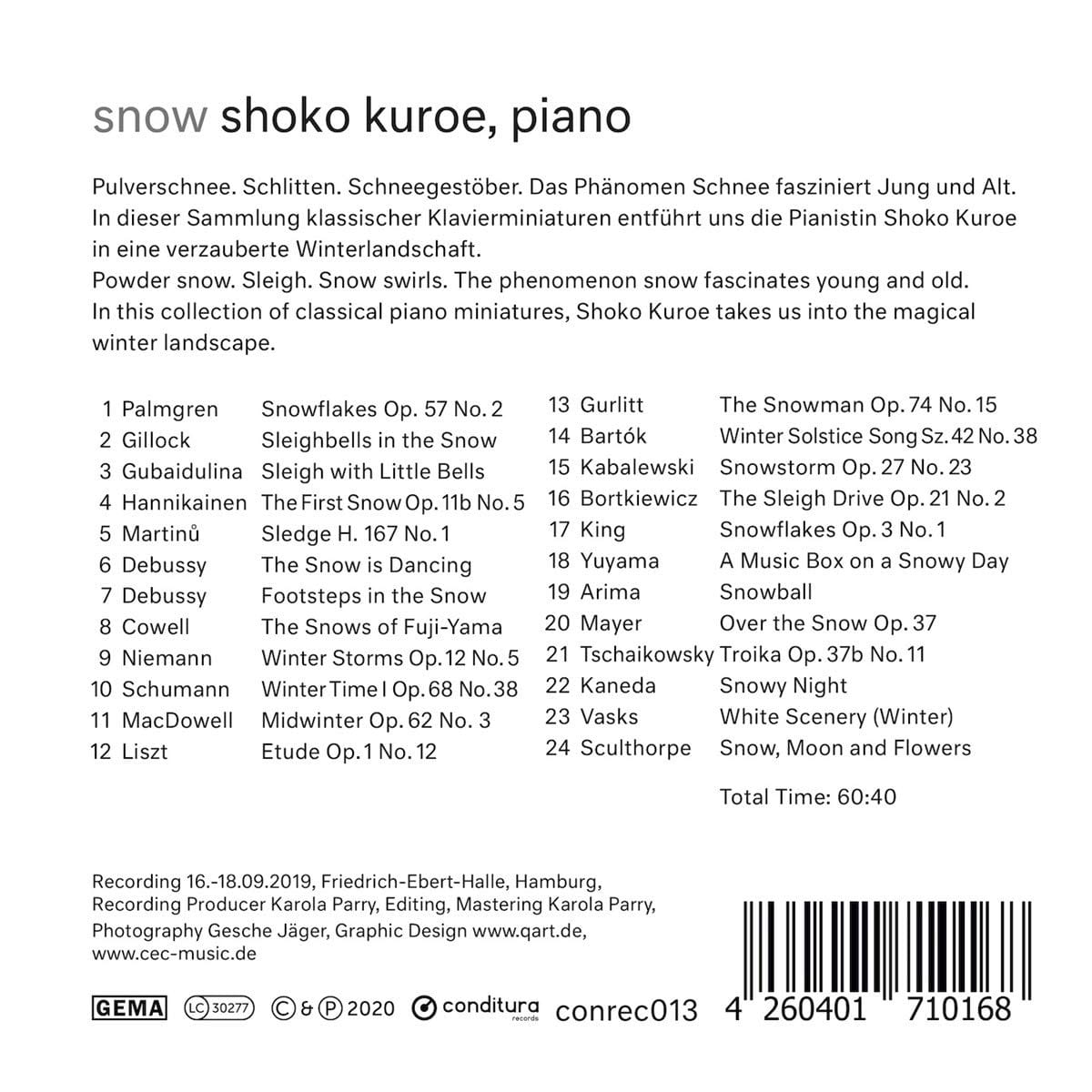 Sommer, Sonne, Sonnenschein. Eine gute Zeit für Gedanken an Schnee. Angeblich gibt es Kulturen, die sehr viele Worte für Schnee haben. Diese CD der Pianistin Shoko Kuroe zeigt, dass wir auch viele Töne für Schnee haben – allein schon auf dem Klavier. Und niemand wird wohl ermessen können, wie viele Töne es für Schnee noch jenseits des Klaviers gibt und wie viele Schnee-Klänge, die nicht titel- oder assoziationsgebend geworden sind. Einen kleinen Ausschnitt bringt diese Zusammenstellung der Pianistin und doch einen Fächer aus Zeit, Klang und Empfindung.