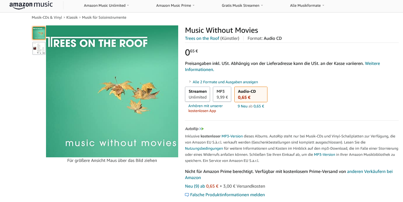 Reden wir von etwas anderem. Trees on the roof ist zugleich Ergebnis eines Crowdfunding-Projekts. Dazu liest man: „TREES ON THE ROOF produzieren Instrumentalmusik für Piano, Violine, Electronics unter Mitwirkung zahlreicher Gast-Instrumentalisten und unterstützen unter anderem auch ein nachhaltiges Umpflanzungsprojekt von Monokultur zu klimastabilem Laubmischwald in Mecklenburg Vorpommern.“